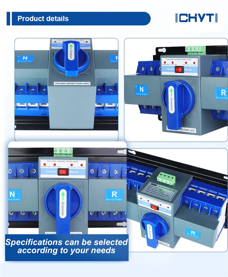 China Suppliers ICHYTI Wholesale elektronisk växelström automatisk överföringsomkopplare är designad för dubbla strömförsörjningssystem med en driftspänning på 230V/400V och en driftsfrekvens på 50/60Hz. Dess maximala märkström är 63A, och den kan konfigureras för att överföra dubbel effekt enligt specifika krav. elektronisk växelströmbrytare för automatisk överföring är utrustad med kortslutningsskydd, brandskydd, dubbelbrytning och utgång PÅ-signalfunktion.