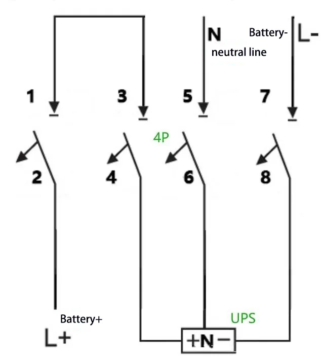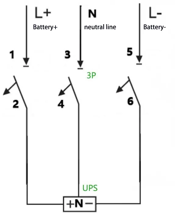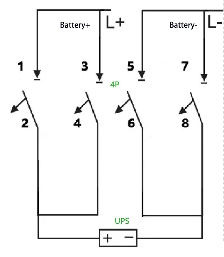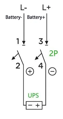 E:Till exempel: För en UPS med en kapacitet på 40 kVA, en nominell batteristräng på 40 celler och en neutral ledningsanslutning (utjämningsspänning: 14 V × 40 = 560 V, dvs. ±280 V), beräknas den maximala driftsströmmen som 40 kVA × 1,0 ÷ 1,0 V A ÷ 10 % ÷ 10 % ÷ 10 % . 4P 750 V 150 A brytare kan användas, med två av dess poler kopplade i serie. Ledningsmetoden är som följer: