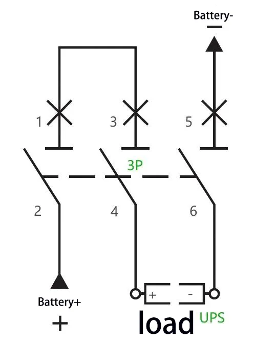 D:Till exempel: För en UPS med en kapacitet på 40 kVA, en nominell batteristräng på 32 celler och neutral trådanslutning (utjämningsladdningsspänning: 14 V × 32 = 448 V, d.v.s. ±224 V), beräknas den maximala driftsströmmen som 40 kVA × 1,0 V ÷ 90% ÷ 90% ÷ 32 A. 3P 500 V 200 A strömbrytare kan användas, och kopplingsmetoden är som följer: